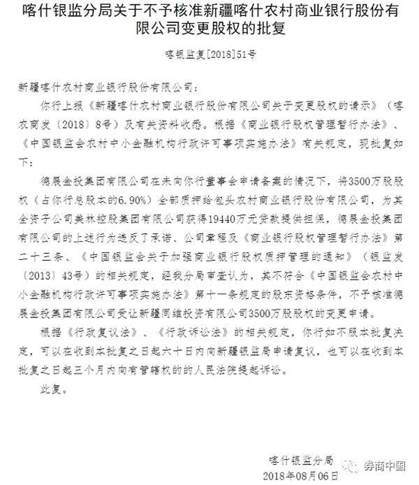 8月8日,新疆喀什銀監(jiān)分局發(fā)布不予核準(zhǔn)喀什銀行變更股權(quán)的批復(fù)。