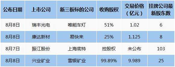 摘要: 8月8日是個吉祥的日子,上市公司瑞豐光電(300241)、康達(dá)新材(002669)分別公布了收購新三板公司的計劃。另外,興業(yè)礦業(yè)(000426)也公布了收購新三板公司雪銀礦業(yè)的草案,雪銀礦業(yè)出售價格約