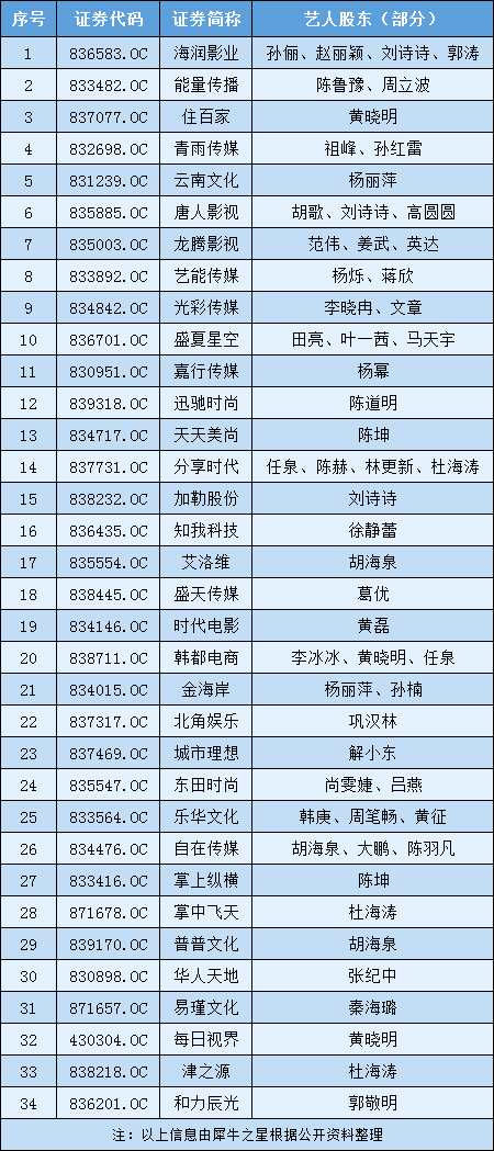 據(jù)不完全統(tǒng)計(jì),在如今新三板掛牌公司的股東榜中,有34家公司出現(xiàn)了藝人股東,如有孫儷、劉詩(shī)詩(shī)、趙麗穎等加持的海潤(rùn)影業(yè),再如陳魯豫、周立波參股的能量傳播,孫紅雷、祖峰入股的青雨傳媒,胡歌、劉詩(shī)詩(shī)、高圓圓參股的唐人影視等等。