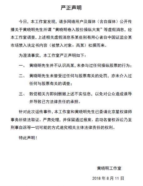 事件經(jīng)曝光后,黃曉明工作室微博隨即發(fā)布聲明公開(kāi)否認(rèn)此事,稱(chēng),“虛假消息系某些別有用心者自中國(guó)證監(jiān)會(huì)某市場(chǎng)禁入決定書(shū)內(nèi)容(被禁入對(duì)象:高某)杜撰而來(lái)”,表示黃曉明并不認(rèn)識(shí)高某,也未曾受過(guò)任何與股票有關(guān)的處罰,亦未介入過(guò)任何與股票有關(guān)的調(diào)查,敦促相關(guān)方撤刪不實(shí)消息,并聲明保留追究法律責(zé)任的權(quán)利。