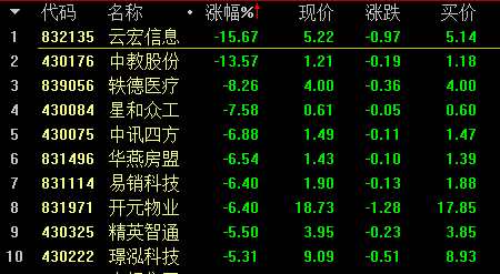 做市股跌幅榜方面,創(chuàng)新層企業(yè)云宏信息(832135)跌15.67%領跌創(chuàng)新層做市股;基礎層方面,ST潤港(832438)跌45%居基礎層跌幅榜首。