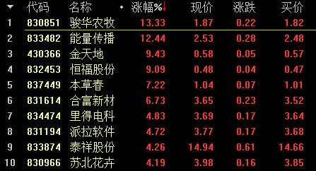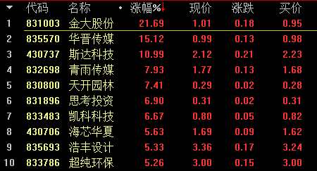 做市漲幅方面,創(chuàng)新層駿華農牧(830851)漲13.33%領漲創(chuàng)新層做市股;基礎層方面,金大股份(831003)漲21.69%居于漲幅榜首。
