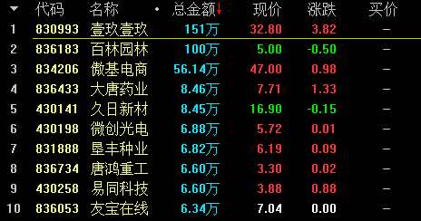 創(chuàng)新層競價交易股票盤內成交額前十名