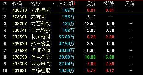 從成交額情況來看基礎層企業(yè)九鼎集團(430719)成交187萬元居首,創(chuàng)新層企業(yè)壹玖壹玖(830993)成交151萬元居首。