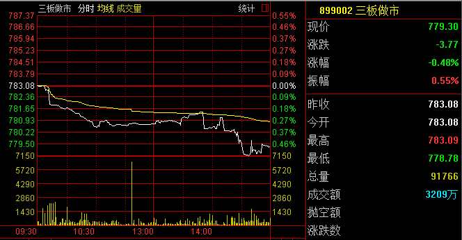 指數方面,三板做市(899002)今日以783.08點開盤,隨后指數震蕩滑落,最低跌至778.78點,截至收盤,報779.30點,跌0.48%,全天成分股成交3209萬元。