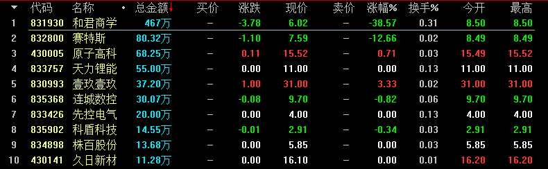 創(chuàng)新層競(jìng)價(jià)交易股票盤(pán)內(nèi)成交額前十名