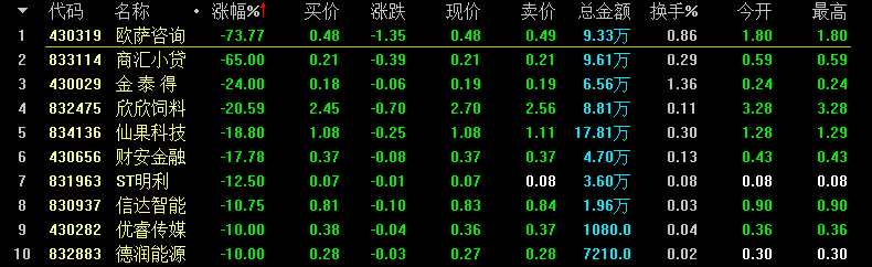 做市股跌幅榜方面,創(chuàng)新層企業(yè)綠之彩(832014)跌7.69%領(lǐng)跌創(chuàng)新做市股;基礎(chǔ)層方面,歐薩咨詢(xún)(430319)跌73.77%居基礎(chǔ)層跌幅榜首。
