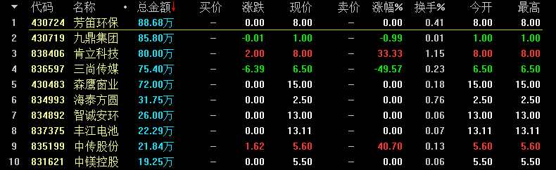 從成交額情況來(lái)看基礎(chǔ)層企業(yè)芳笛環(huán)保(430724)成交88.68萬(wàn)元居首,創(chuàng)新層企業(yè)和君商學(xué)(831930)成交467萬(wàn)元居首。