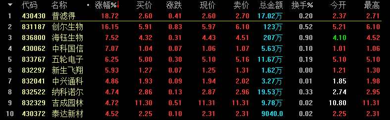 創(chuàng)新層做市股漲幅前十名