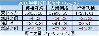 從新三板5家頭部游戲企業(yè)來看,截至8月24日,除智明星通(872801)、心動(dòng)網(wǎng)絡(luò)(833897)未披露2018年半年報(bào)外,英雄互娛(430127)、華清飛揚(yáng)(834195)、力港網(wǎng)絡(luò)(834385)的營(yíng)收和凈利均出現(xiàn)雙降。