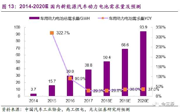 【光大證券(601788)、股吧】一份研究報(bào)告中測算,“在新能源汽車需求的持續(xù)拉動(dòng)下,預(yù)計(jì)到2020年,動(dòng)力電池需求量約94GWh,2018-2020 年CAGR為34%”。