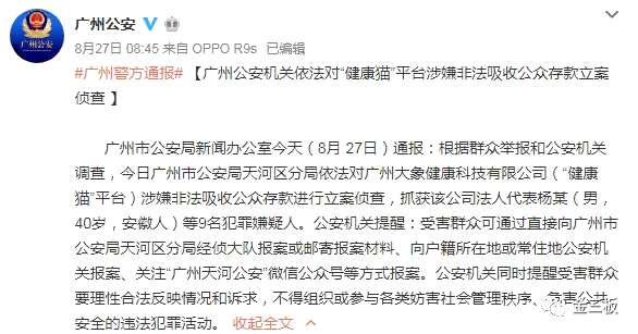 8月27日,廣州公安依法對(duì)“健康貓”平臺(tái)運(yùn)營(yíng)方廣州大象健康科技有限公司涉嫌非法吸收公眾存款進(jìn)行立案?jìng)刹椋カ@該公司法定代表人楊某等9名犯罪嫌疑人。