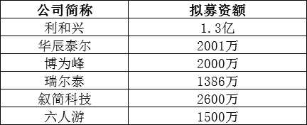 摘要: 8月29日,新三板共6家企業(yè)啟動新一輪融資,分別是利和興(834013)、敘簡科技(838934)、博為峰(836392)、華辰泰爾(870348)、六人游(872385)、瑞爾泰(839841),6