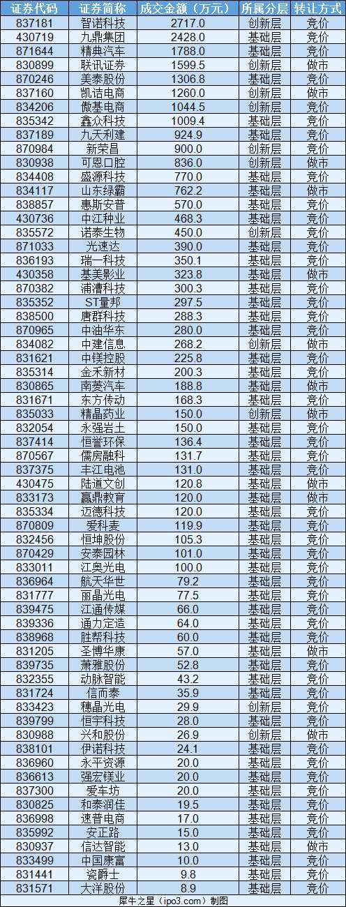累計成交金額前五名的新三板企業(yè)分別為:智諾科技(837181)成交2717.00萬元、九鼎集團(tuán)(430719)成交2428.00萬元 、精典汽車(871644)成交1788.00萬元、聯(lián)訊證券(830899)成交1599.50萬元、美泰股份(870246)成交1306.80萬元。