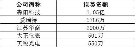 摘要: 8月30日,新三板共5家企業(yè)啟動新一輪融資,分別是森陽科技(835504)、愛瑞特(834721)、江蘇華商(871056)、大正儀表(872715)、英銳光電(838631),5家企業(yè)擬合計(jì)募資2.
