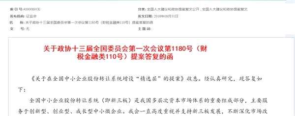 8月31日,證監(jiān)會通過官網(wǎng)答復(fù)政協(xié)委員提案,表示將指導(dǎo)評估新三板市場制度,將深入論證在創(chuàng)新層之上再設(shè)置精選層,這是證監(jiān)會首次提及新三板精選層。