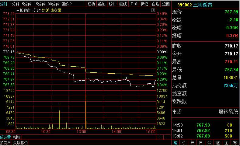 指數(shù)方面,三板做市(899002)今日以770.17低開,隨后開始震蕩下行,最低跌至767.34點,尾盤有小幅拉升但未翻紅,截至收盤,報767.89點,跌0.30%,全天成分股成交2355萬元。