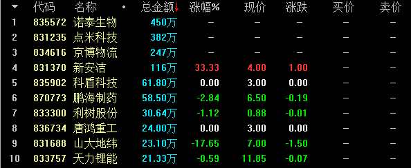 創(chuàng)新層競價交易股票盤內成交額前十名
