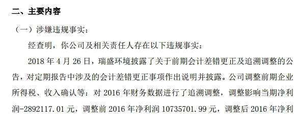 據(jù)全國(guó)股轉(zhuǎn)公司披露,經(jīng)查明,2018年4月26日瑞盛環(huán)境披露了關(guān)于前期會(huì)計(jì)差錯(cuò)更正及追溯調(diào)整的公告,將2015-2016年的利潤(rùn)各調(diào)低了150萬(wàn)和289萬(wàn),并調(diào)整前期企業(yè)所得稅、收入確認(rèn)等。