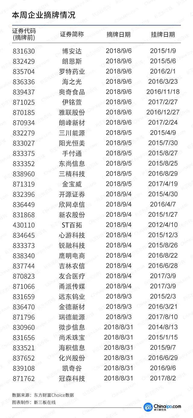 本期(2018年8月31日至9月6日),33家公司正式摘牌。其中,9月4日有開源證券、欣網(wǎng)卓信等10家公司終止新三板掛牌。