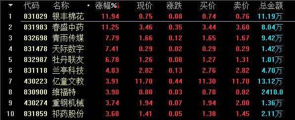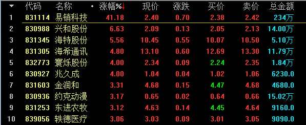 做市漲幅方面,創(chuàng)新層易銷科技(831114)漲41.18%領(lǐng)漲創(chuàng)新層做市股;基礎(chǔ)層銀豐棉花(831029)漲11.94%居于漲幅榜首