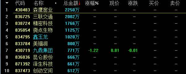 創(chuàng)新層競價(jià)交易股票盤內(nèi)成交額前十名