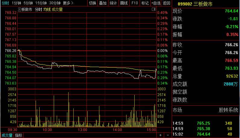 指數(shù)方面,三板做市(899002)今日以766.26點(diǎn)開盤,隨后一路震蕩下行,最低跌至763.93點(diǎn),收盤前拉升但未翻紅,截至收盤,報(bào)764.64點(diǎn),跌0.21%,全天成分股成交2888萬元。