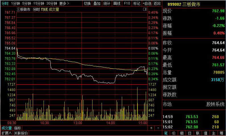 指數(shù)方面,三板做市(899002)今日以764.64點(diǎn)開盤,隨后震蕩下行,最低跌至761.57點(diǎn),截至收盤,報(bào)762.98點(diǎn),跌0.22%,全天成分股成交3158萬元。