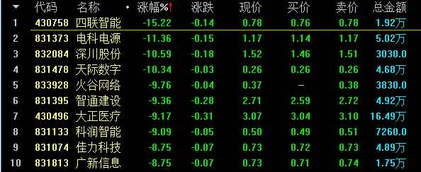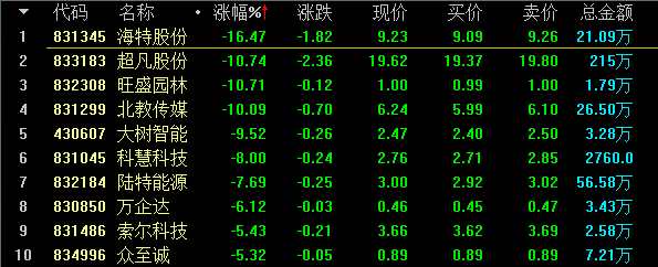 做市股跌幅榜方面,創(chuàng)新層企業(yè)海特股份(831345)跌16.47%領(lǐng)跌創(chuàng)新做市股;基礎(chǔ)層企業(yè)方面,四聯(lián)智能(430758)跌15.22%居基礎(chǔ)層跌幅榜首。