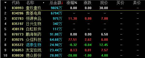 創(chuàng)新層競價(jià)交易股票盤內(nèi)成交額前十名