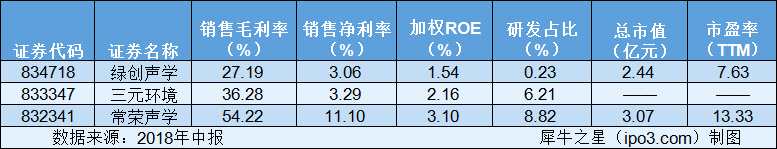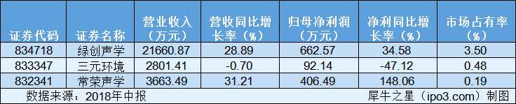 由于行業(yè)規(guī)模相對(duì)較小且分散,目前噪聲與振動(dòng)控制行業(yè)仍未有上市公司,新三板上從事噪音治理相關(guān)業(yè)務(wù)的公司僅有3家,另外兩家分別為三元環(huán)境(833347)、常榮聲學(xué)(832341)。
