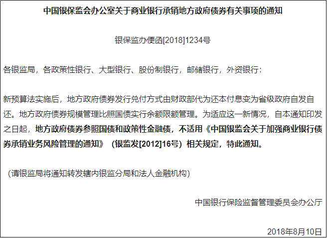 根據(jù)近日銀保監(jiān)會(huì)下發(fā)的關(guān)于商業(yè)銀行承銷地方政府債券有關(guān)事項(xiàng)的通知,取消了此前規(guī)定的地方銀行購(gòu)買自身發(fā)行的地方政府債券總量不應(yīng)超過(guò)該只債券20%的要求。