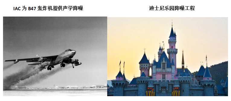 在服務(wù)案例上,IAC曾為世界上第一種實(shí)用的戰(zhàn)略噴氣式轟炸機(jī)B47提供聲學(xué)降噪設(shè)備;為迪士尼樂(lè)園實(shí)施降噪工程;為保時(shí)捷提供整車聲品質(zhì)的全消音室;還曾為英國(guó)BBC演播廳提供噪聲控制設(shè)備。