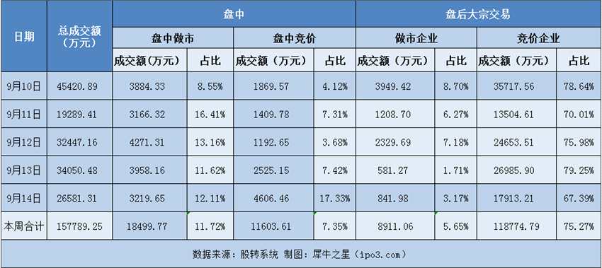 本周(9月10日—9月14日)新三板市場(chǎng)交易總額為15.78億元,其中盤(pán)內(nèi)成交3.01億元,盤(pán)后大宗交易成交12.77億元。