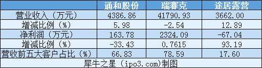 業(yè)績方面,2018年半年報顯示,通和股份、瑞賽克、途居露營的營收分別為4386.86萬元、4.18億元、3662萬元,其中瑞賽克營收最高,但同比下滑2.54%;凈利方面,通和股份和瑞賽克實現(xiàn)盈利,途居露營虧損67.04萬元。