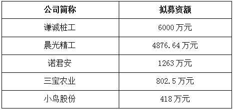 9月17日,新三板4家企業(yè)啟動新一輪融資,分別是晨光精工、三寶農(nóng)業(yè)、謙誠樁工、小鳥股份、諾君安,合計擬募資1.34億元。