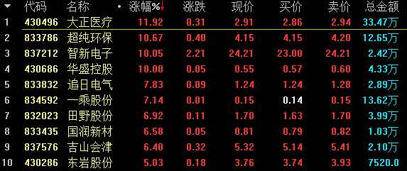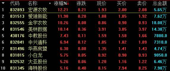 做市漲幅方面,創(chuàng)新層宏源農(nóng)牧(832893)漲12.21%領(lǐng)漲創(chuàng)新層做市股;基礎(chǔ)層大正醫(yī)療(430496)漲11.92%領(lǐng)漲基礎(chǔ)層做市股。