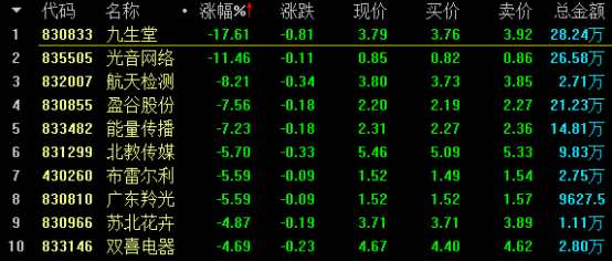 做市股跌幅榜方面,創(chuàng)新層九生堂(830833)跌17.61%居創(chuàng)新層跌幅榜首;基礎(chǔ)層綠健神農(nóng)(831851)跌24.06%居跌幅榜首。