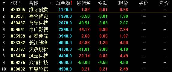 創(chuàng)新層競(jìng)價(jià)交易股票盤(pán)內(nèi)成交額前十名