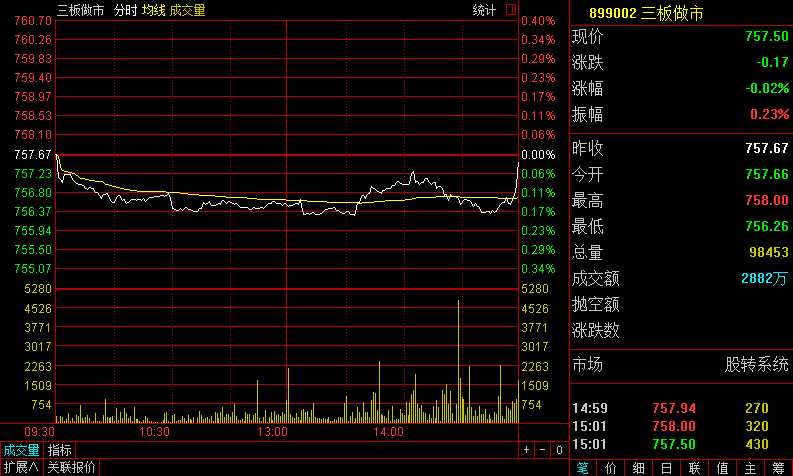 指數(shù)方面,三板做市(899002)今日以757.66點(diǎn)低開(kāi),隨后持續(xù)下行,最低跌至756.26點(diǎn),截至收盤(pán),報(bào)757.5點(diǎn),跌0.02%,全天成分股成交2882萬(wàn)元。