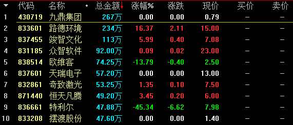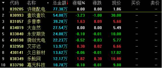創(chuàng)新層競價交易股票盤內(nèi)成交額前十名
