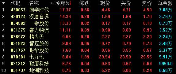 做市漲幅方面,創(chuàng)新層本草春(837449)漲9.91%領漲創(chuàng)新層做市股;基礎層國學時代(430053)漲17.37%領漲基礎層做市股。