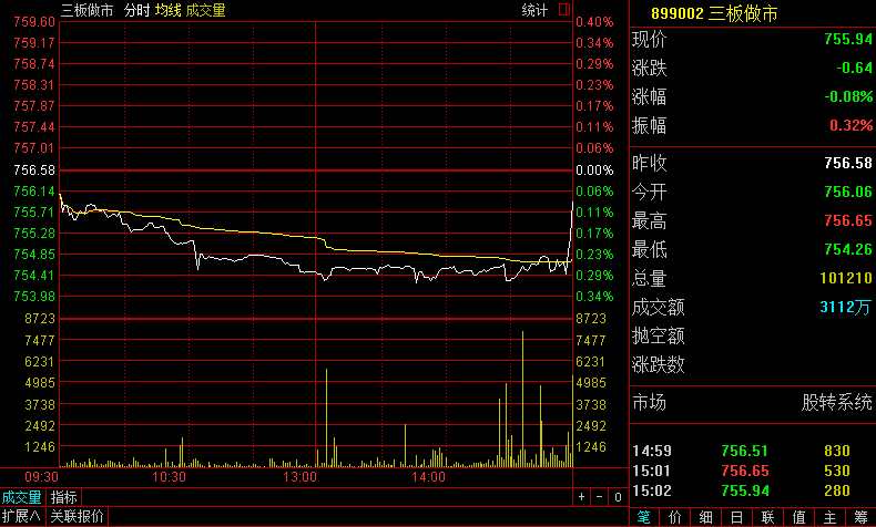 指數(shù)方面,三板做市(899002)今日以756.06點低開,隨后震蕩下行,最低跌至754.26點,截至收盤,報755.94點,跌0.08%,全天成分股成交3112萬元。