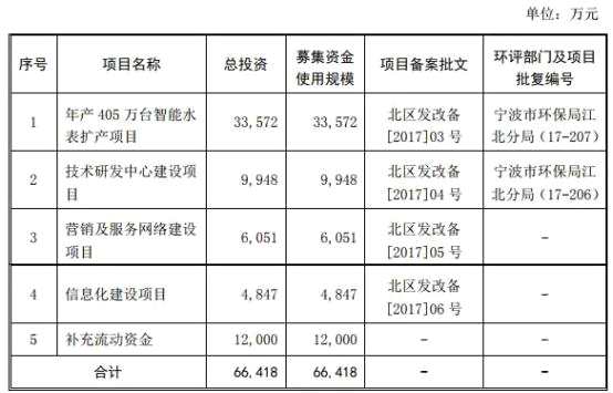 寧波水表的募集資金擬用于年產(chǎn)405萬臺智能水表擴產(chǎn)項目、技術(shù)研發(fā)中心建設(shè)項目、營銷及服務網(wǎng)絡(luò)建設(shè)項目、信息化建設(shè)項目和補充流動資金。