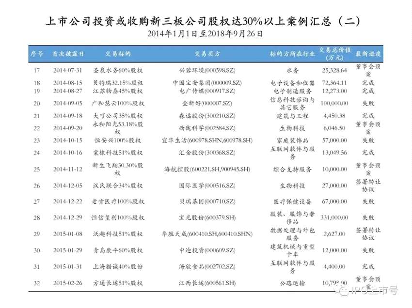 后續(xù)的表格中列舉的是自2014年1月1日至2018年9月26日上市公司投資或收購新三板企業(yè)股權(quán)達30%以上的案例,但是由于收集手段、收集途徑和精力的問題,可能存在掛一漏萬、錯漏百出的情形,還請各位讀者自行甄別,如下的案例僅供參考: