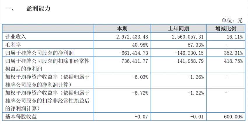 1、報告期內(nèi),公司實(shí)現(xiàn)銷售收入297.24 萬元,比上年同期相比提高16.11%;資產(chǎn)總計1,218.93萬元,凈資產(chǎn)1,063.24 萬元,與上年同期相比略有下降;凈利潤-66.14 萬元,虧損較上年增加352.31%。與去年同期相比公司虧損增加主要是由于新開發(fā)的集成業(yè)務(wù)毛利率較低,使得營業(yè)成本增加;同時,公司加大研發(fā)投入,研發(fā)費(fèi)用增加;最后,公司為符合公司的業(yè)務(wù)發(fā)展更換主辦券商,使得公司的審計咨詢費(fèi)、證券顧問費(fèi)大幅增加所致。