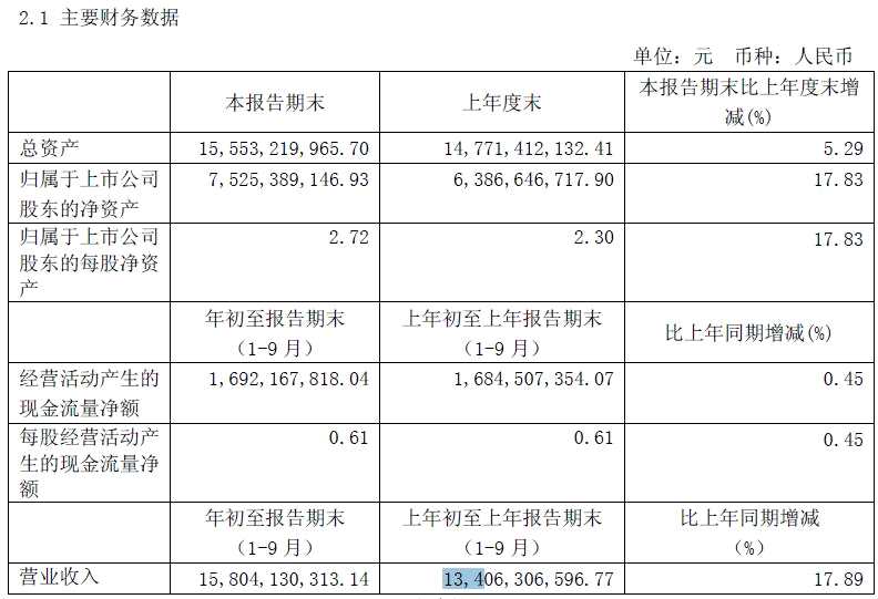 前三季度收入158億元,去年同期為134億元,同比增長17.89%;利潤為12.8億元,去年同期為9.96億元,同比增長28.21%;總資產(chǎn)155.5億元,去年同期為147.7億元,同比增長5.29%;歸屬于上市公司股東的凈資產(chǎn)75.25億元,同比增長17.83%。