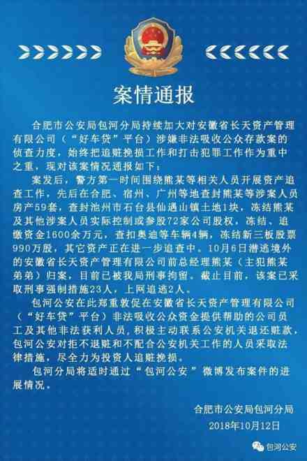 摘要: 10月12日消息,日前有消息稱安徽省長(zhǎng)天資產(chǎn)管理有限公司(“好車貸”平臺(tái))涉嫌非法吸收公眾存款,合肥市公安局包河分局于今日發(fā)布了此次案件的最新通知。據(jù)公開資料顯示,2018年7月28日晚,安徽P2P平