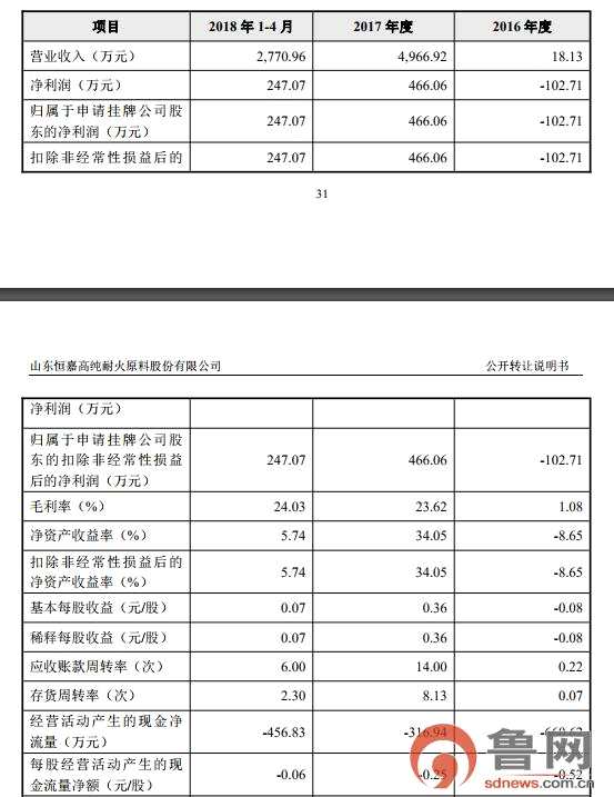 山東恒嘉位于山東省濱州市鄒平縣,成立于2014年9月17日,法定代表人邵長波,注冊資本7808萬元,主要業(yè)務(wù)為高純耐火原料的研發(fā)、生產(chǎn)和銷售。據(jù)公開轉(zhuǎn)讓說明書,山東恒嘉2016、2017、2018年1-4月分別實(shí)現(xiàn)營收18.13萬元、4,966.92萬元、2,770.96萬元,凈利潤分別為-102.71萬元、466.06萬元、247.07萬元。