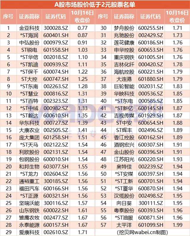 據(jù)挖貝研究院數(shù)據(jù)顯示,截止到10月16日收盤,A股市場(chǎng)上股價(jià)低于2元的股票共57只。對(duì)比一個(gè)月前(9月17日),股價(jià)低于2元的股票共31只。